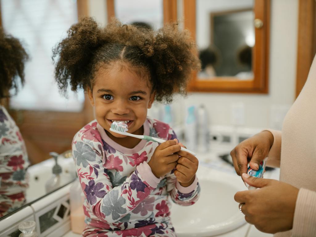 One should teach their child the right brushing technique with a soft-bristled toothbrush and a pea-sized amount of fluoride toothpaste. Encourage children to brush twice a day, gently scrubbing all tooth surfaces, including the front, back, and chewing surfaces. Ensure they reach the gum line and brush for at least two minutes.
